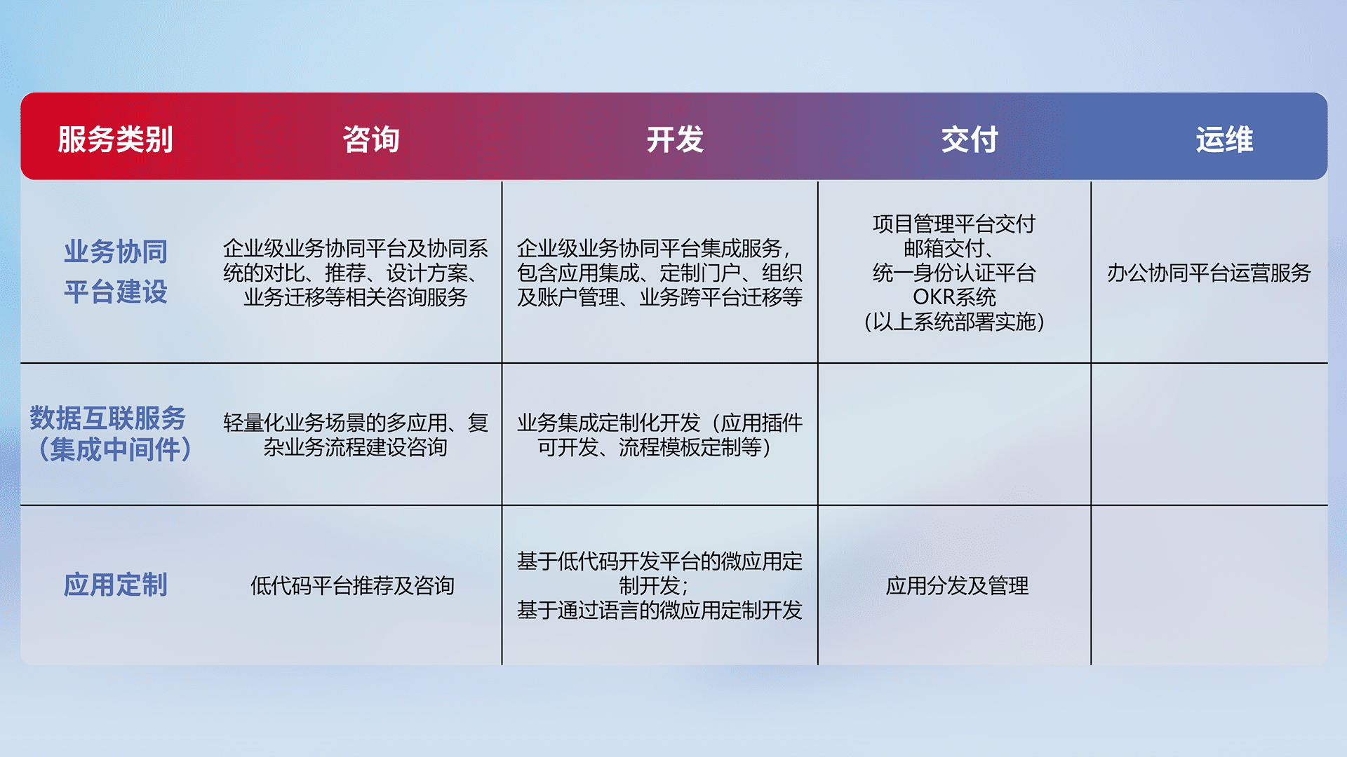 针对钉钉、、、、企微、、IDaas等平台级产品提供产品的规划、、、方案、、交付、、、、定制化开发等服务,,实现如统一协同办公、、、、智能客户服务、、、、混合会议管理、、、智能数据查询、、、、等业务场景,,实现数字化转型。。