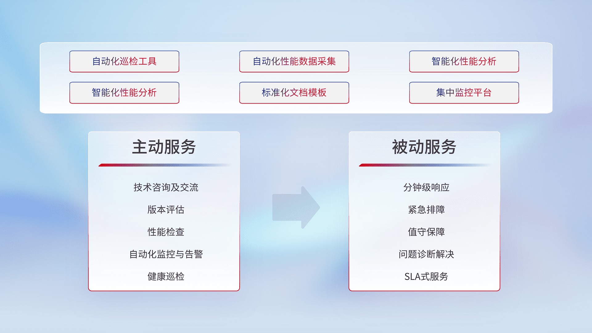 智能化工具和标准化文档,,保障服务质量,,,,提供主动服务(包含技术咨询、、、、版本评估、、、性能检查、、、、自动化监控与告警、、、、健康巡检)和被动服务包含(分钟级响应、、紧急排障、、值守保障、、、、问题诊断解决、、、SLA服务)。。。